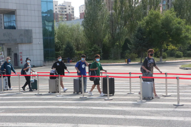 省内在读学生进行返校报到。依照疫情防控工作要求,返校时学生们都佩戴口罩并间隔1米配合检测体温,学校志愿者们依次检验了登车(机)前48小时内核酸检测阴性纸质版证明。