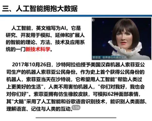 沈老师首先向同学们介绍了云计算的最初目标并详细的讲解了云计算的发展过程。随后是关于大数据的讲解,沈老师主要从数据的收集、处理与应用几方面向大家进行了介绍。紧接着,沈老师以史上首个获得公民身份的机器人——索菲亚为例引出对人工智能的介绍,强调了大数据与人工智能之间的关系。最后,沈老师讲解了三者关系的完美融合。