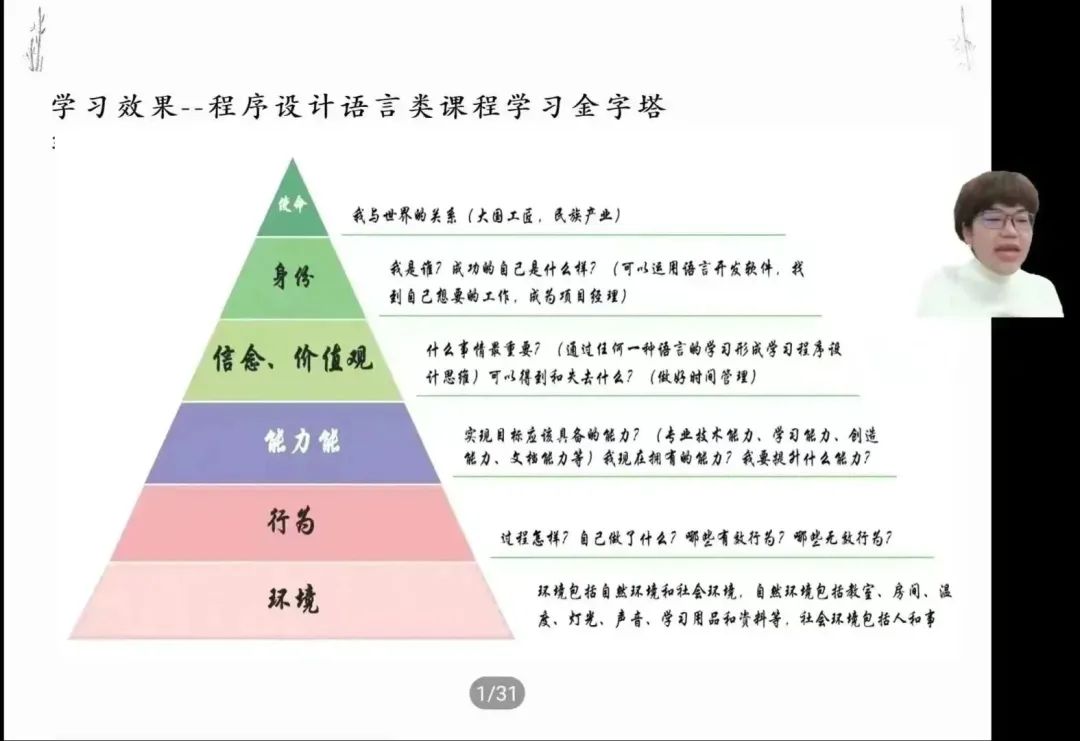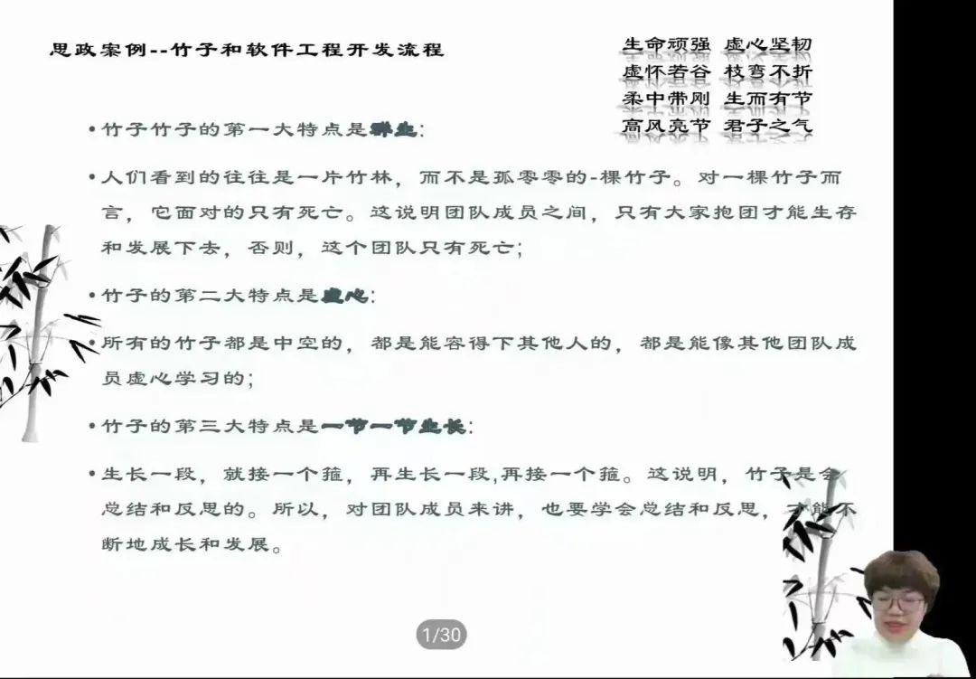 首先,赵老师利用从12306软件到云游兴城的思政案例,带大家感受了软件专业的魅力与实力。中间通过多次互动活跃了课堂气氛,增强了课程的趣味度,同时也引入了讲座学习的背景。赵老师将竹子与软件工程结合起来,细致讲解了软件的开发流程,提高了同学们对软件专业的进一步认识。最后以汉诺塔、金字塔的例子收尾,教给大家“遇到问题不要着急,要按部就班,一步一步来”的心境,让同学们对未来的学习目标更加明确。