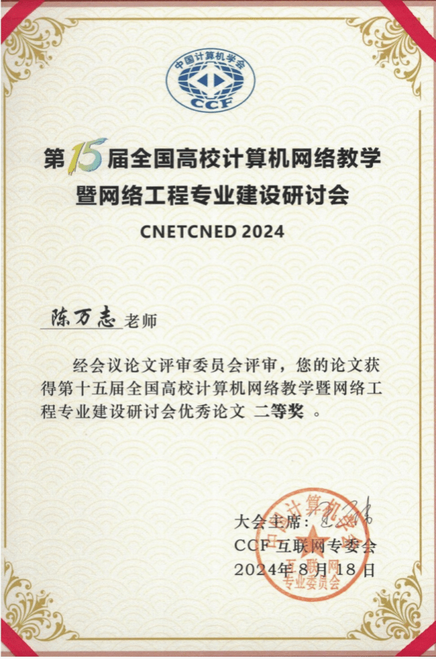 网络工程专业负责人,投稿的教改论文《人工智能背景下地方行业院校的计算机网络课程建设实践》被大会评选为优秀论文二等奖,并在大会分论坛进行报告交流,与会高校代表对团队依托省一流线上线下混合课程建设地方行业院校在人工智能时代的计算机网络专业核心主干课程的实践进行汇报交流,突出立体化、新形态教材+知识图谱+AI助教和教学资源丰富,教学运行可视化,数据中心一站式支撑特色。积极宣传增强我校影响力,为学科专业建设贡献力量。