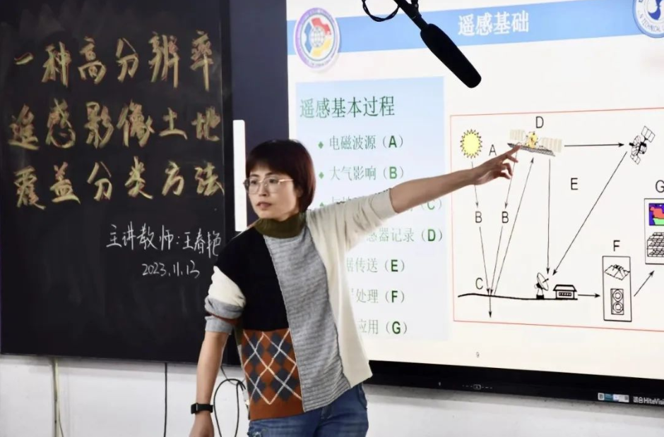 讲座伊始,王春艳副教授从遥感技术和高分辨率遥感影像土地覆盖分类两大方面进行了主要概述。接下来,王老师从遥感的基础定义出发,引导大家深入理解并分析遥感数据,并对遥感的来源进行了介绍。之后,王老师通过对遥感技术的基本过程的讲解,引出了遥感的类型,并且对可见光和红外遥感等类型进行了细致的阐述,同时介绍了遥感技术在不同领域的实际应用。最后,王老师通过具体的模型向同学们生动地演绎了相关概念,使得抽象的理论变得更加形象和易于理解。