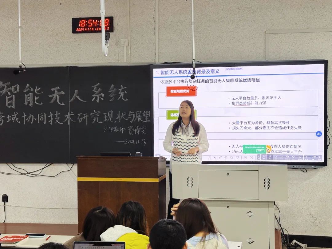 在尔雅楼121教室成功举办了《智能无人系统跨域协同技术研究现状与展望》主题科研训练讲座。本次讲座由学院费博雯副教授主讲,软件工程专业2022级与2023级共200余名学生参加了本次讲座。