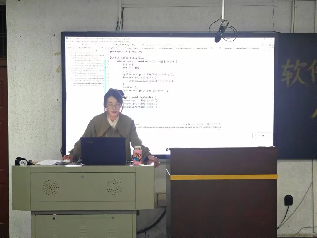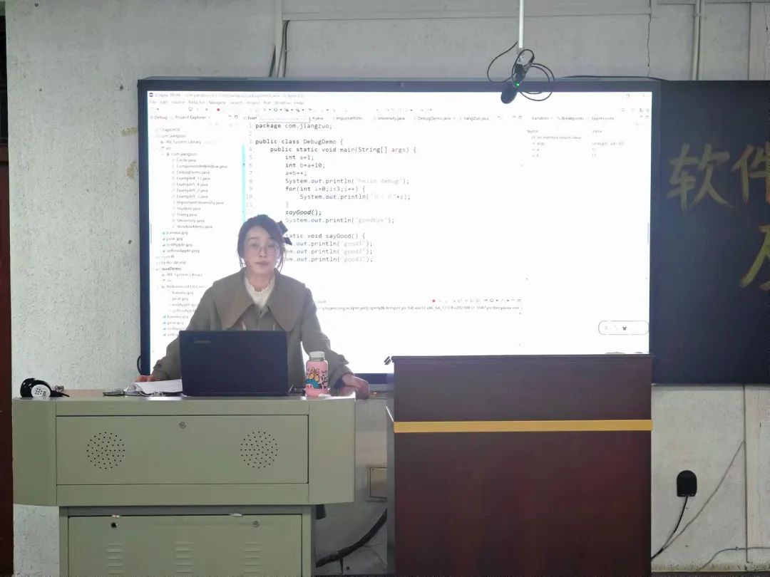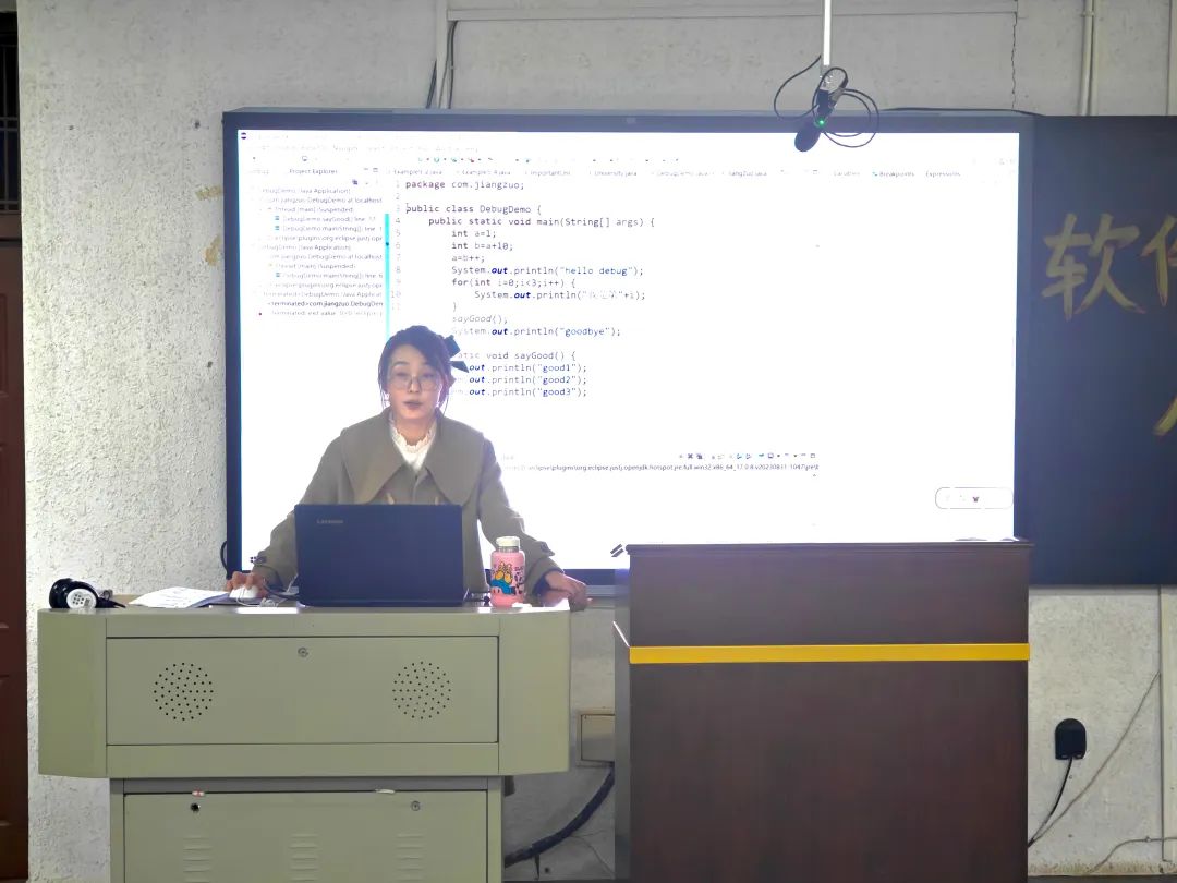 讲座伊始,梁林林老师对Eclipse编辑器进行了详细的讲解。首先,梁老师展示了Eclipse的基本界面及各个功能模块,并阐述了每个模块的作用。接着,老师通过实操演示,深入剖析了Eclipse的智能补全、代码语法检查等功能,展示了用这些工具提高编程效率并减少错误的方法。