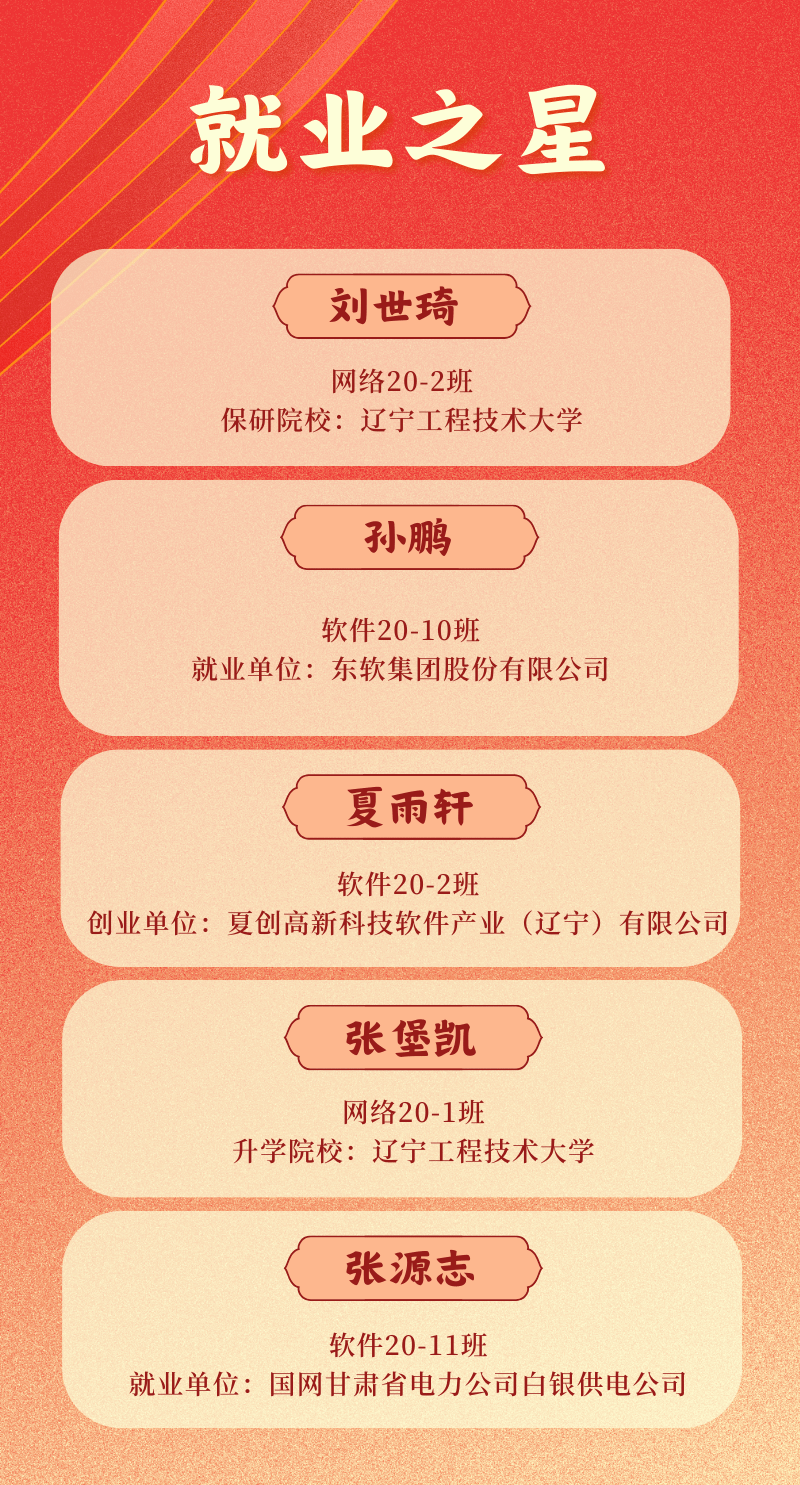 为深入贯彻落实全国两会精神,引导毕业生“立大志、明大德、成大才、担大任”,进一步深化以“成才观、职业观、就业观”为核心的就业育人工作,表彰优秀毕业生,激励在校生成为堪当民族复兴重任的时代新人,小妲己直播 评选出2024届“就业之星”,他们分别是: